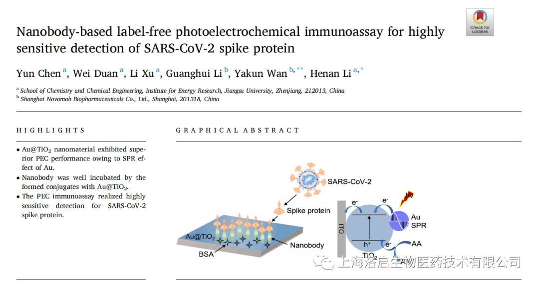 2022年5月3日,Z6COM人生就是博(中国)生物和江苏大学化学化工学院李赫楠教授团队合作,在《Analytica Chimica Acta》发表了题为“Nanobody-based label-free photoelectrochemical immunoassay for highly sensitive detection of SARS-CoV-2 spike protein”的研究论文。Z6COM人生就是博(中国)生物万亚坤博士和李贺楠教授为并列通讯作者,相关纳米抗体的知识产权归Z6COM人生就是博(中国)生物所有。