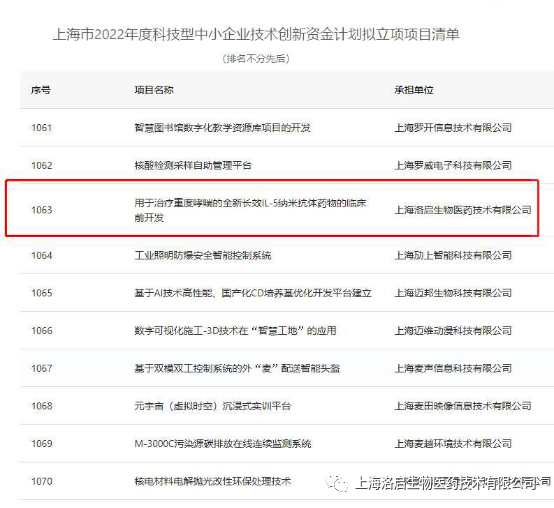 近期,上海市科学技术委员会组织的“上海市2022年度科技型中小企业技术创新资金计划”拟立项项目名单公示完毕,Z6COM人生就是博(中国)生物“用于治疗重度哮喘的全新长效IL-5纳米抗体药物的临床前开发”项目入围。